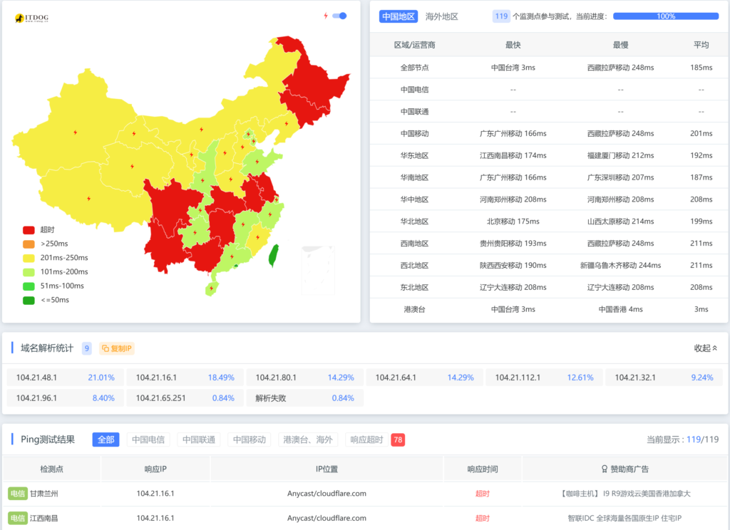 Cloudflare小黄云不可用 x | 2025-1-01 17:17 | 5,617 | 随笔 72 字 | 1 分钟内 Cloudflare小黄云开启之后,默认分配的地址使用itdog全国节点ping,大部分都是超时状态。Cloudflare的zero trust tunnels也受影响。 使用CF A到serv00 节点IP 正常访问的方式同样不可用。